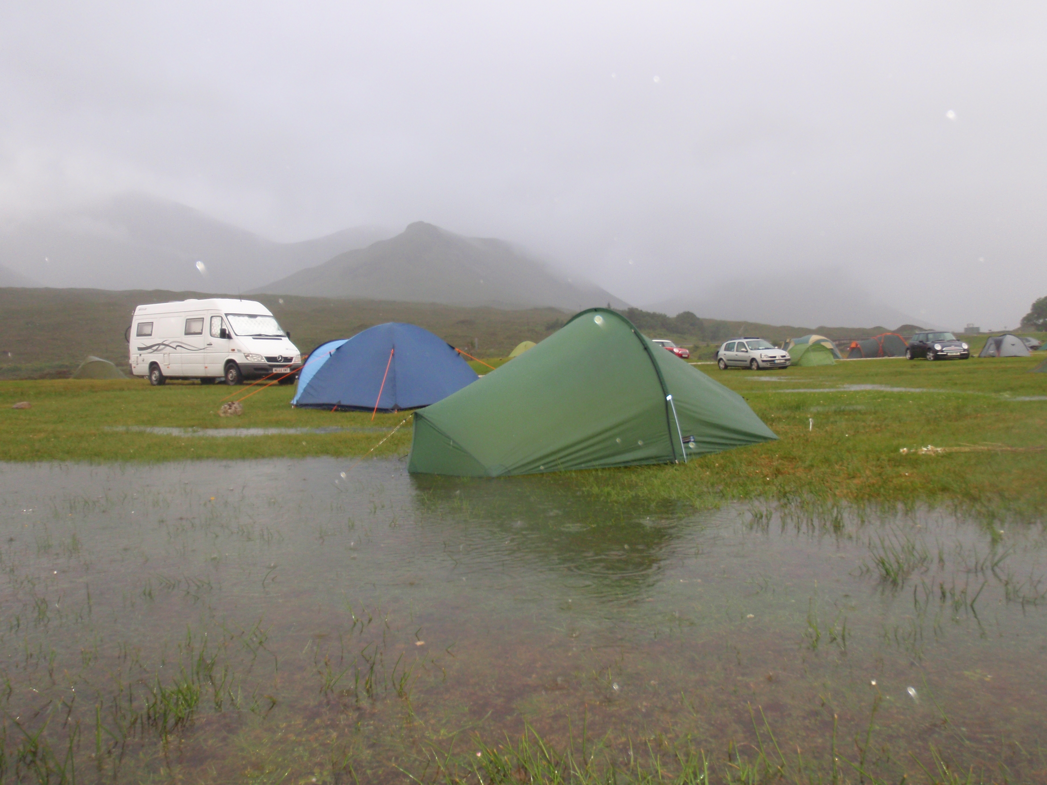 By the time I reached Skye, Scotland’s weather gave me one last hammering. I arrived at Sligachan at midnight, putting up my tent in the dark and as a light rain fell. The rain became heavier and heavier, becoming a downfall of biblical proportions. At 3am I woke with the sensation of dampness around my feet. My sleeping bag was drenched, the lower end of my tent harbouring an inch-deep flood of water. I evacuated, spending the rest of the night in the campsite’s laundry room. This was the delightful scene in the morning.