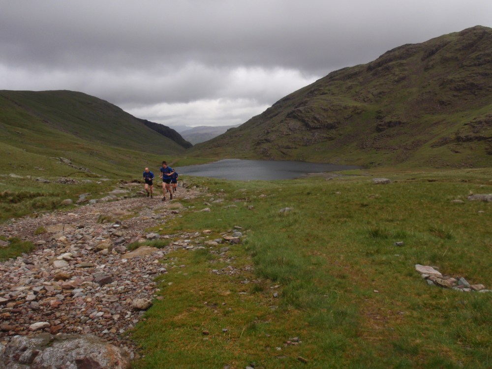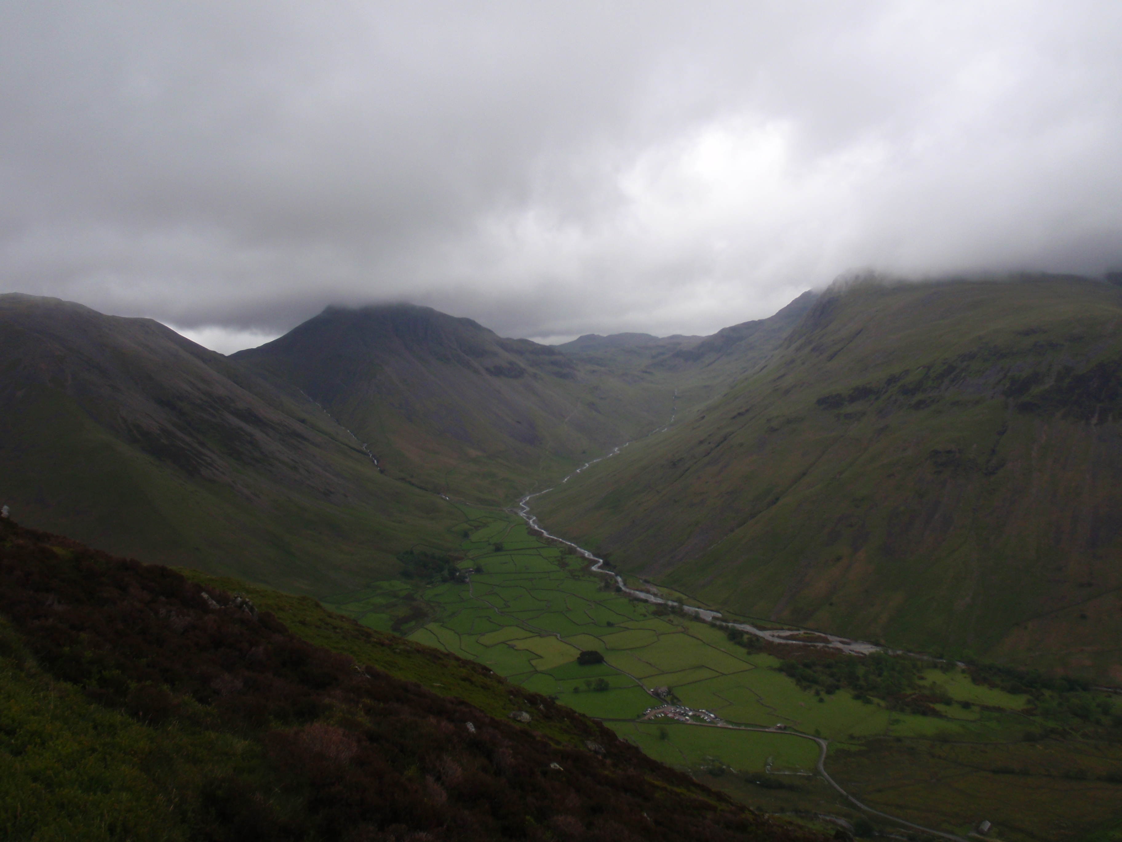 We climbed gently at first, Grains Gill on our right, the hills in the far distance cloaked in mist, until we crossed humpbacked Stockley Bridge, and our companion was Styhead Gill. We were soon passing Styhead Tarn and then Sty Head pass, where the wonderful vista of Wasdale revealed itself. A joyous run down a path of scree brought us into the valley.