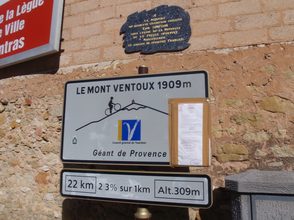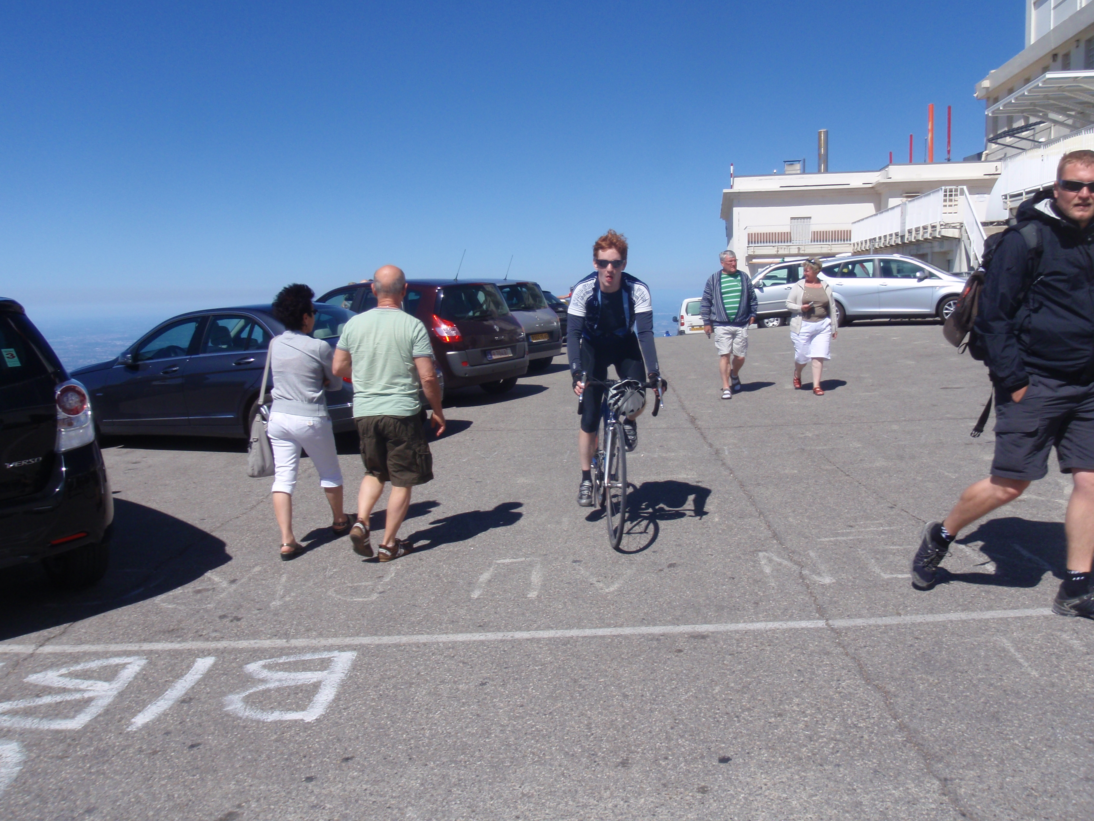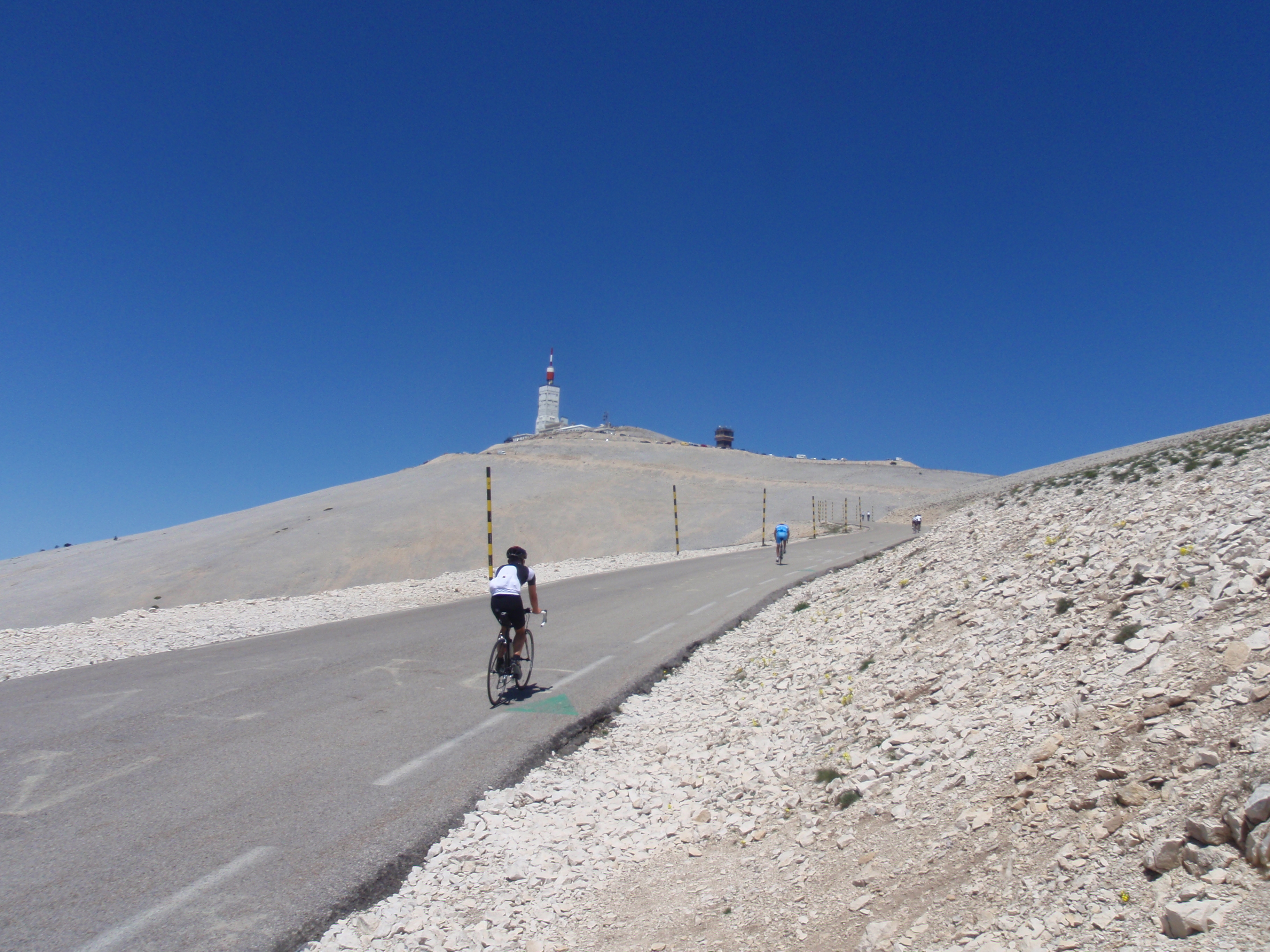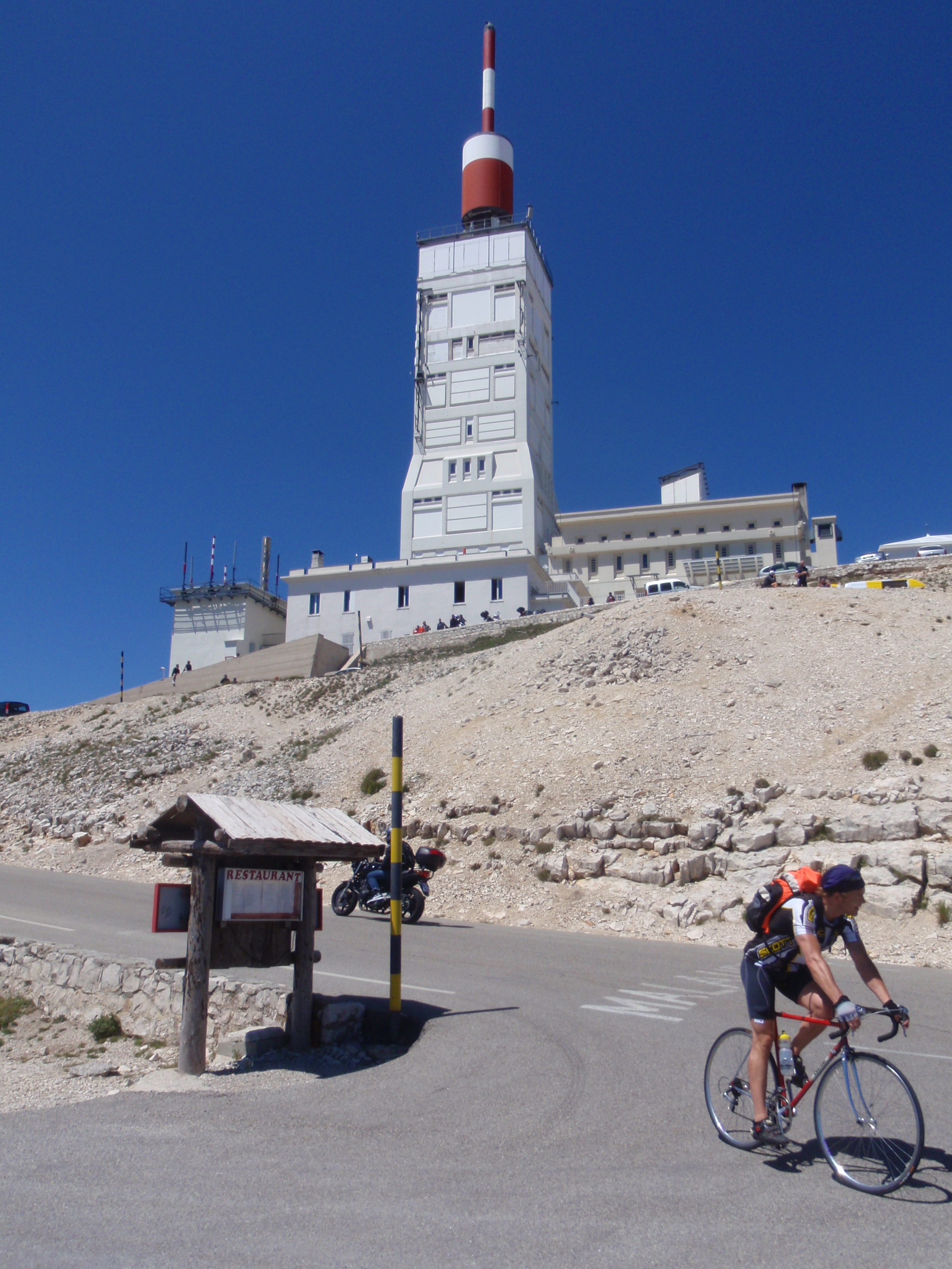 I took his advice, although my legs began to wilt terribly in the penultimate kilometre. The bonk was upon me. It was little wonder, for the gradient had ramped up to 10.2 per cent. But the summit was in sight, and inspired by thoughts of Armstrong, Merckx, Pantani and Simpson, and the maniacal crowds that cheered them on, I dropped into the easiest gear, hauled myself off my seat and pedaled as furiously as I possibly could to the roof of Provence, gaining the summit one hour and 46 minutes after leaving Bedoin.