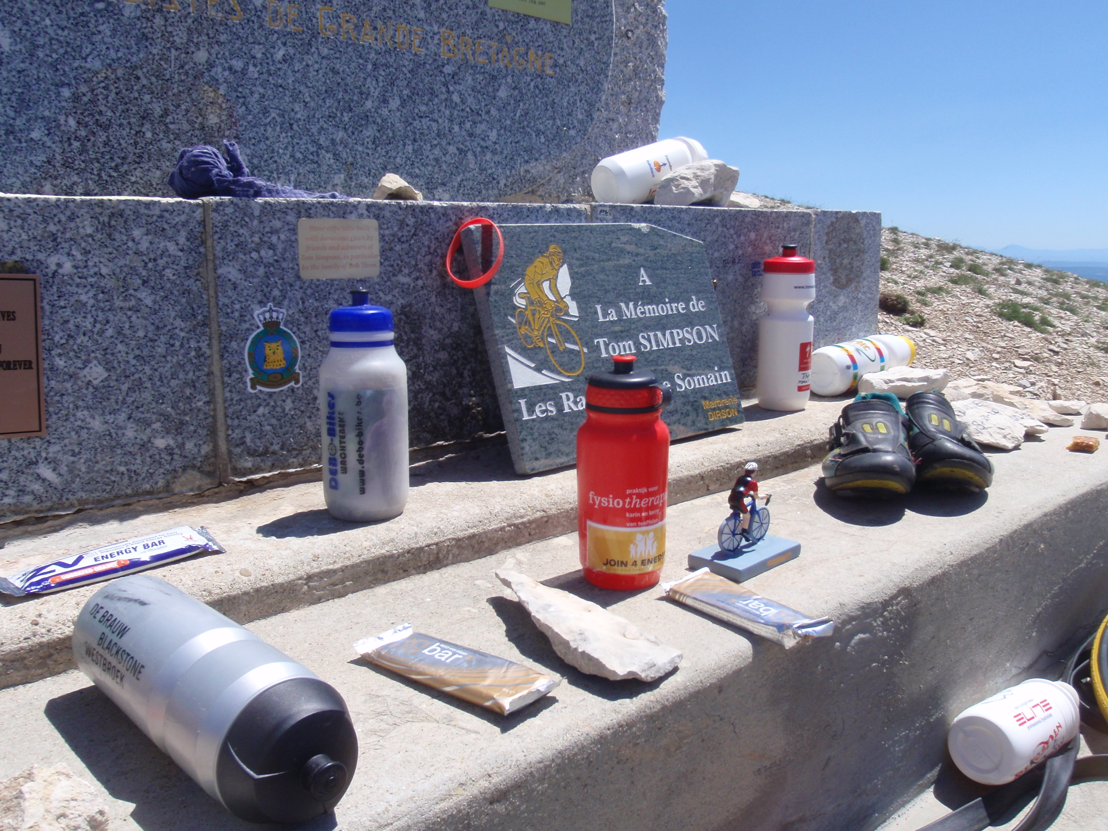 With around 2km to go, I passed Tommy’s shrine, decorated by gifts left by cyclists – water bottles, cycling trinkets, shoes, tubes and, ironically, energy bars – how Tommy could have done with one of those. A load of tat really. Symbolic tat, nonetheless. Yet this was the place where Tommy Simpson pedaled his last stroke: I shivered, despite the baking heat. His final words were apparently: ‘Go on, go on!’ As the French would say: ‘Chapeau Tommy!’