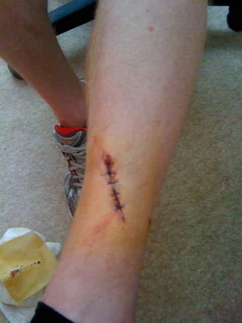 Just to complicate matters further, Tom yesterday – while riding at around 20mph – took a tumble in Richmond Park. He was untouched by car or cycle; the road was dry and straight. It seemed he leaned to the left to loosen a shoe, only to career off the road, flip upside down and embed his shin bone into something very sharp and pointy. He was carted off to St George’s in Tooting, with Nick and I following by bike. The unfortunate consequences are below.