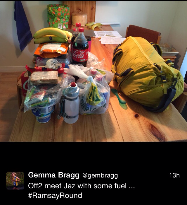 At 9.57am, he reaches the Loch Treig dam, the tracker reveals. Gemma tweets again. In the pictures, the sky is blue and the day bright. Charlie sits on a stool. There are other seats but Jez is standing in all the photographs. I know what he is eating because Gemma tweeted a picture of Jez’s ‘fuel’ a few minutes earlier: bananas, sandwiches, Coke and rice pudding. It was reassuringly simple.