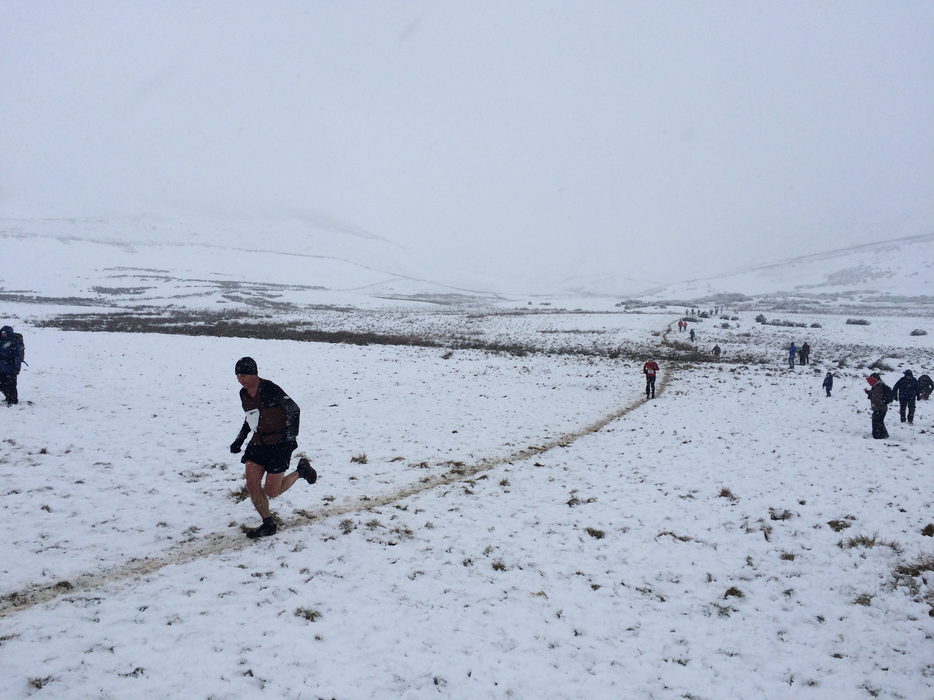 To this white world we went, dumped by coaches in a field next to the A702. We trudged in a sullen line to the start, pathetically trying to avoid premature wet feet by hurdling the saturated ground. We arrived to the apocalypse: amid a sodden, snowy wasteland stood a cluster of tents containing half-starved shivering people, clasping hot liquid and looking across to a hazy white chaos encasing the hills, all wondering the same thing: what the hell are we doing here?