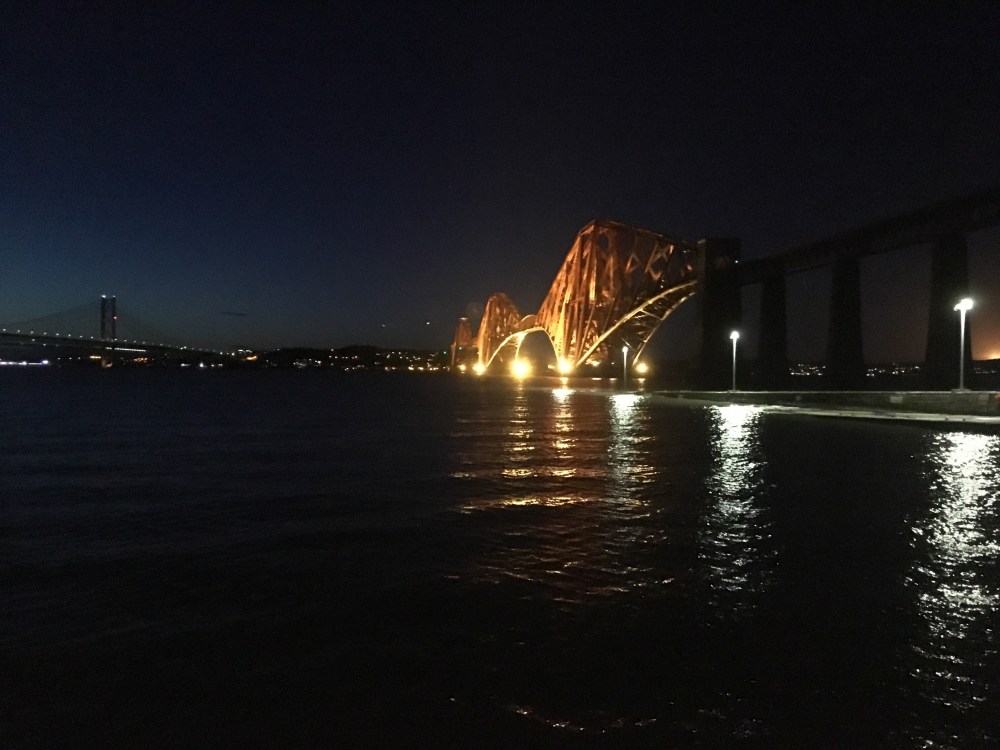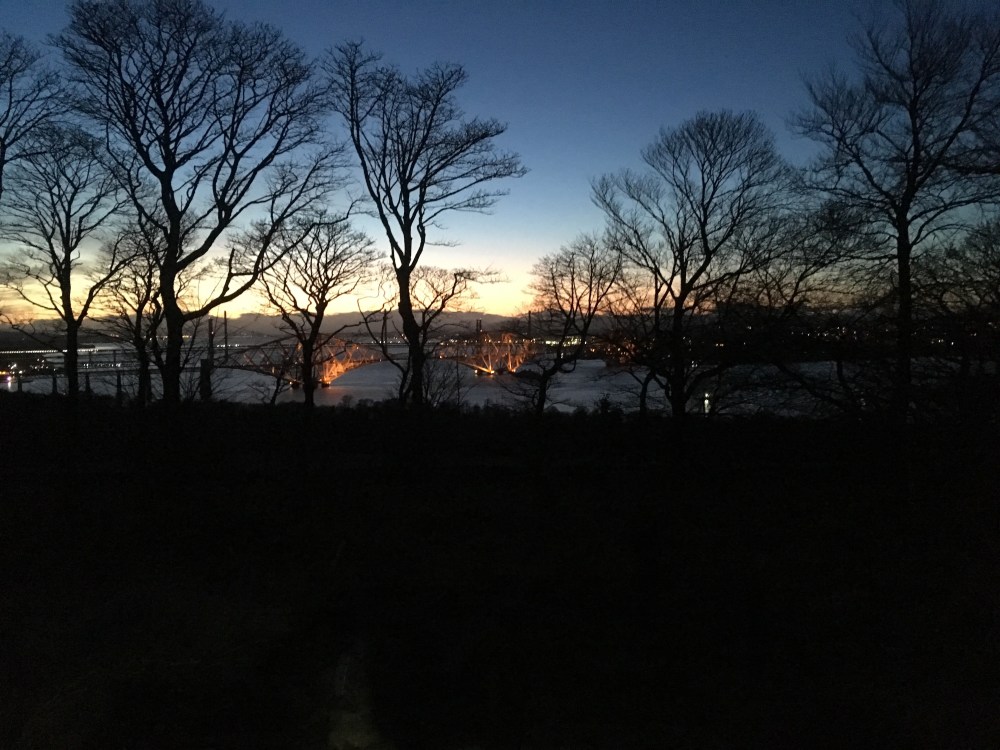 There was still one more: Mons Hill, some six miles away. When I was at school, the motto of Bob, our inherently-lazy-but-fast captain, was ‘the faster you run, the faster you finish’. I thought of Bob now, as I chased sunset, churning along the cycle track that lines the A90. From the summit of Mons Hill, the dark, silent Forth was illuminated by moored ships, and – higher than where I stood – reared the Forth Rail Bridge, receding into blackness.